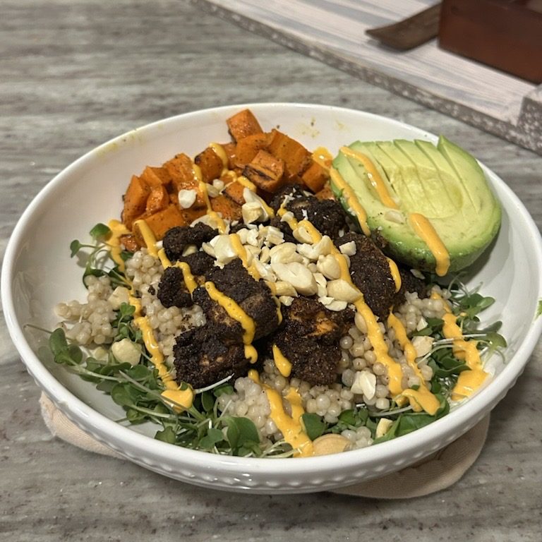 - Plate! Once salmon is done cooking, place in bowls with quinoa or rice. Top with chipotle yogurt and green onions.