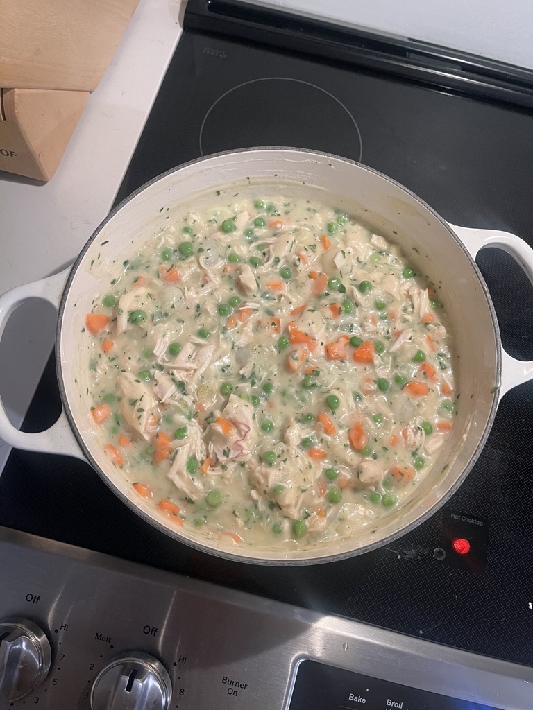 A snow day on February 1, 2026 called for something cozy! This is true restaurant-grade chicken pot pie, so yes it’s decadent but it’s perfect. I had never cooked with split chicken breasts, but it was so easy. Boneless chicken breasts or rotisserie chicken would work fine as well, as long as you end up with 4-6 cups cooked chicken. I also used one big pot, and though the filling bubbled over and the crust didn’t brown, it was still delicious and much easier for meal prep.