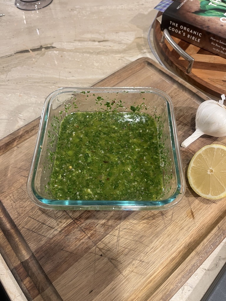 - Add parsley, cilantro, oregano, and red pepper flakes to the food processor. Then pour in olive oil while pulsing several times until herb leaves are finely minced (they should have some body and texture).