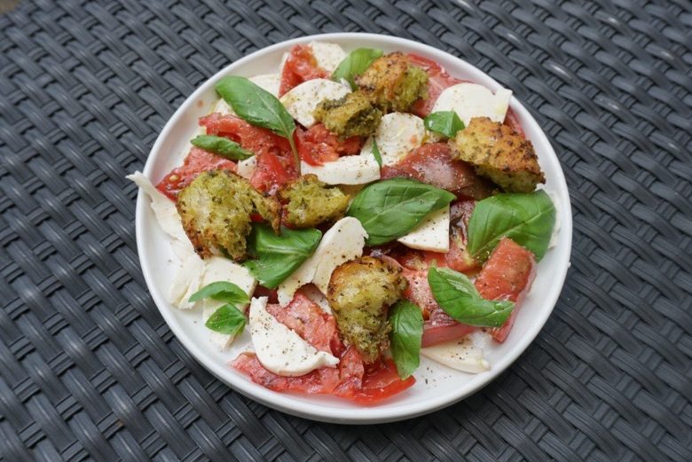 - Arrange the tomatoes and mozzarella on a large platter, drizzle with the remaining olive oil, sprinkle with basil, season to taste with salt and pepper and top with the croutons. This salad is best served room temperatures