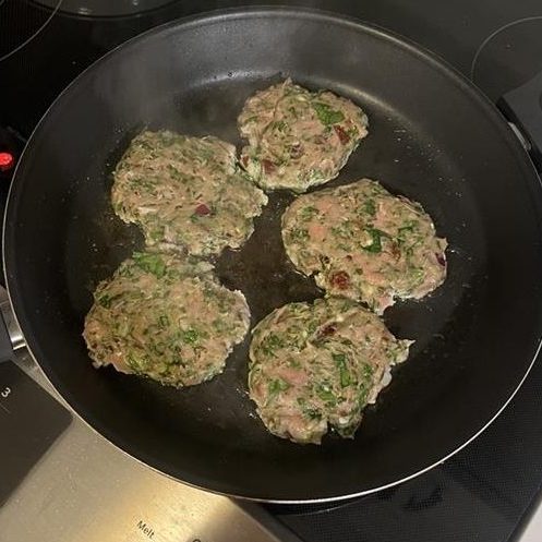 - Combine burger ingredients together, minus the avocado oil, and mix until combined. Form into 4-5 patties.