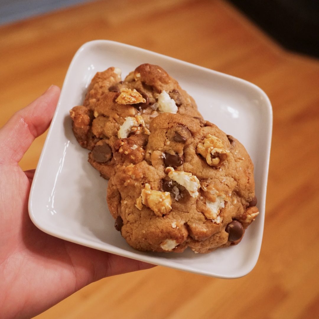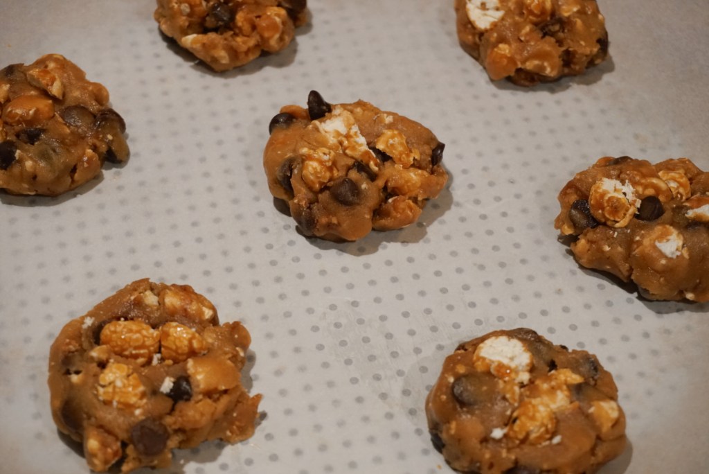 - Roll the dough into about 1 1/2 inch balls (45-50 grams each). Place cookies on the prepared sheet tray, about 2 inches apart. Flatten each cookie slightly into a thick disk. Top each cookie with more crushed popcorn.