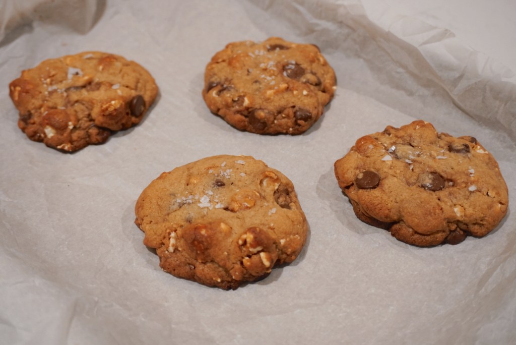 - Bake for 10-12 minutes until golden on the edges, but still chewy in the middle. They will seem somewhat underbaked in the middle when you first pull them from the oven. Sprinkle the cookies with flakey salt immediately after removing them from the oven.