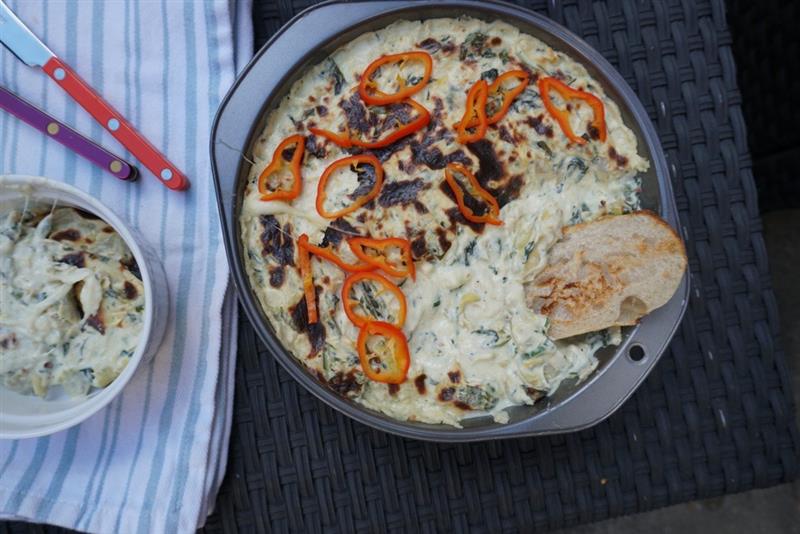 - Transfer the sheet pan with the dip into the oven and broil for 3 minutes or until golden brown on top and bubbly. Top with remaining fresno peppers. Serve hot with the toasted bread and pickled peppers on the side.