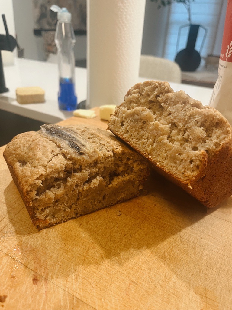 - Bake at 250F for around 45 minutes to 1 hour. The banana bread is cooked when a skewer is inserted and comes out clean.