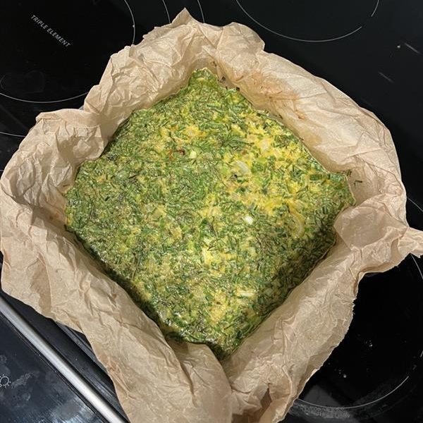 - Pour the egg and greens mixture into an 8X8 inch dish lined with parchment paper. Bake for 20 minutes, or until the eggs are set.