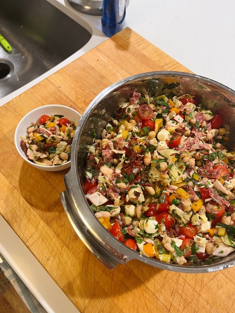 - Roughly chop the deli meats and add to the bowl with the veggies and herbs.